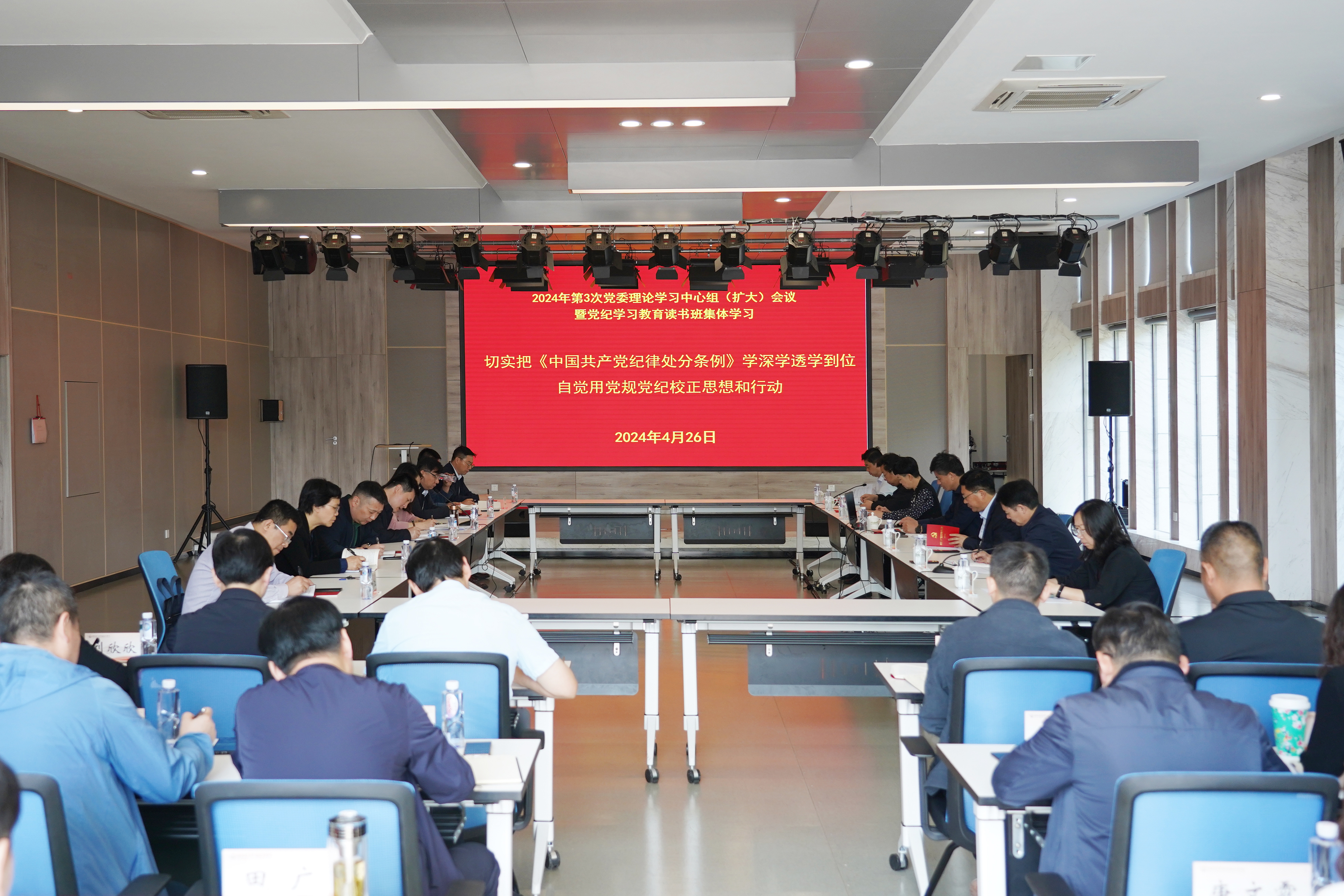 4月26日上午,学校党委理论学习中心组在大学科技园路演大厅召开2024年第3次学习(扩大)会议暨党纪学习教育读书班集中学习,主题为“切实把《中国共产党纪律处分条例》学深学透学到位,自觉用党规党纪校正思想和行动”。校党委理论学习中心组成员以及全体中层干部正职参加会议。会议由党委书记朱东风主持。