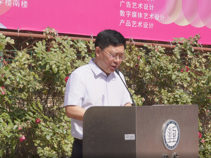 沈士德在致辞中祝福全体毕业生前程似锦、事业有成。他指出,近年来,艺术设计学院努力做“小而精”的发展模式,其建设发展取得了有目共睹的成绩,招生规模持续增长,师资力量不断提升,实训资源逐步更新,教师齐心协力深耕专业建设,成果显著。针对艺术设计学院的发展,学校始终坚持“以人民为中心”的设计、创作导向,推行“乡土民艺”为底色的办学理念,扎根中国大地,深耕淮海地区优秀传统文化沃土,“在地性”办学特色凸显并得到社会充分认可。他相信艺术设计学院能够达成“十四五”办学目标,成为实时匹配人工智能“新技术、新工艺、新材料”迭代的淮海经济区高职本科层次艺术设计人才培养高地。