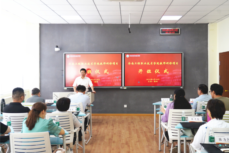开班仪式上,沈士德代表学校对参培教师表示热烈欢迎,他简要介绍了学校的基本情况、办学思路及发展前景。他表示,此次培训是加强校际间交流合作的一个重要举措,对提升参培教师专业与课程建设能力具有重要意义,希望本次培训能够取得圆满成功。济南工程职业技术学院人事处表示,本次培训是学校优质高等职业院校教师队伍建设对标提升建设方案的一项重要内容,对促进学校高质量发展具有重要的意义,希望参训教师能够高度重视此次培训,认真完成教学课程。
