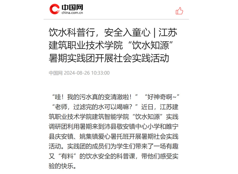 通过开展大学生“三下乡”暑期社会实践暨饮用水安全宣讲活动,进一步推动大学生触摸基层民情,引导大学生发挥专业优势,为农村饮水安全贡献青春力量。(张亮、杨海波)