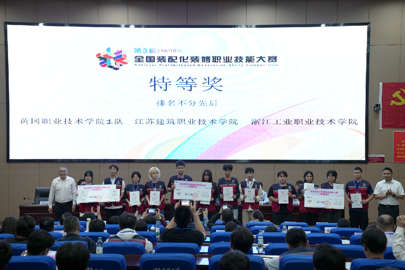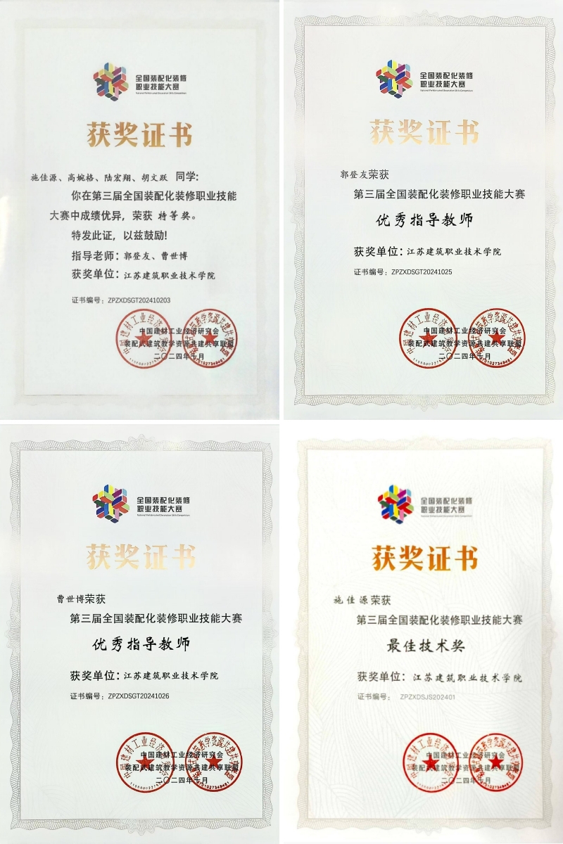 10月17日-18日,由中国建材工业经济研究会、全国装配化装修产教融合共同体主办,黄冈职业技术学院承办的全国第三届装配化装修职业技能大赛决赛暨装配化装修“新专业”建设论坛在湖北黄冈举行。由MK(中国)建筑装饰学院学生施佳源、高婉格、陆宏翔、胡文跃组成的参赛队伍获特等奖,同时施佳源获最佳技术奖,指导教师郭登友、曹世博获“优秀指导教师”称号。