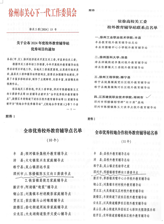 近日,徐州市关心下一代工作委员会发布《关于公布2024年度校外教育辅导站优秀项目的通知》,MK(中国)关工委帮扶共建的校外教育辅导站——邳州市陈楼镇陈玉文向日葵读书点被评为2024年度“全市优秀校外教育辅导站”、邳州市邢楼镇郁雪群向日葵读书点被评为2024年度“全市优秀校地合作校外教育辅导站”。