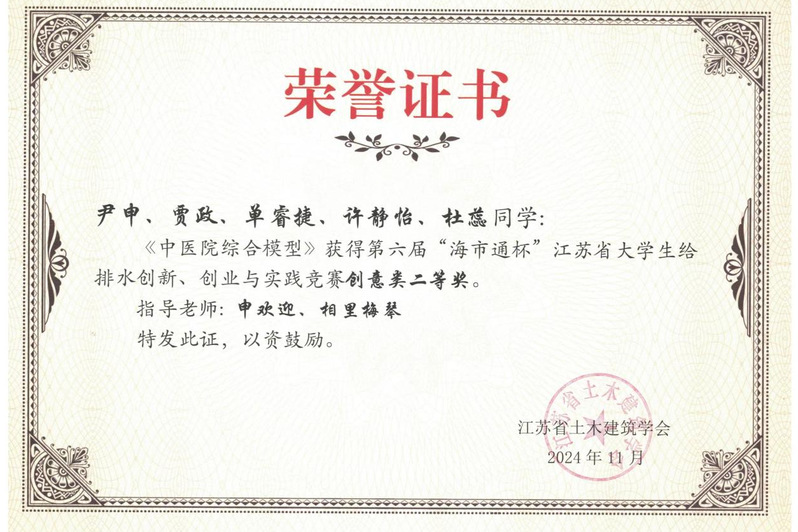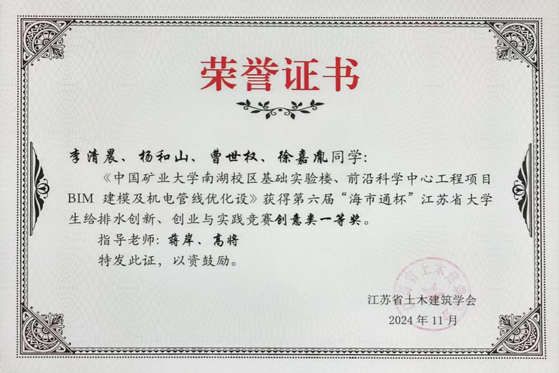 11月28日-30日,2024年城镇给水排水新技术交流会暨江苏省给水排水学术交流年会在无锡宜兴举办,此次会议公布了2024年第六届“海市通杯”江苏省大学生给排水创新、创业与实践竞赛评审结果并举行了颁奖仪式。项目《中国矿业大学南湖校区基础实验楼、前沿科学中心工程项目BIM建模及机电管线优化设》(参赛学生:李清晨、杨和山、曹世权、徐嘉胤,指导教师:蒋岸、高将)获创意类一等奖,项目《中医院综合模型》(参赛学生:尹申、贾政、单睿捷、许静怡、杜蕊,指导教师:申欢迎、相里梅琴)获创意类二等奖,学生季俊池、李茜如获论文类二等奖。