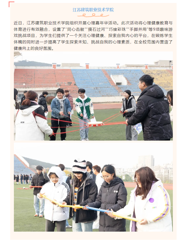 近日,MK.COM组织开展心理嘉年华活动。此次活动将心理健康教育与体育进行有效融合,设置了“同心击鼓”“摸石过河”“巧接彩珠”“手脚并用”等9项趣味游戏挑战项目,为学生们提供了一个关注心理健康、探索自我内心的平台,在锻炼学生体魄的同时进一步提高了学生探索未知、挑战自我的心理素质,在全校范围内营造了健康向上的良好氛围。