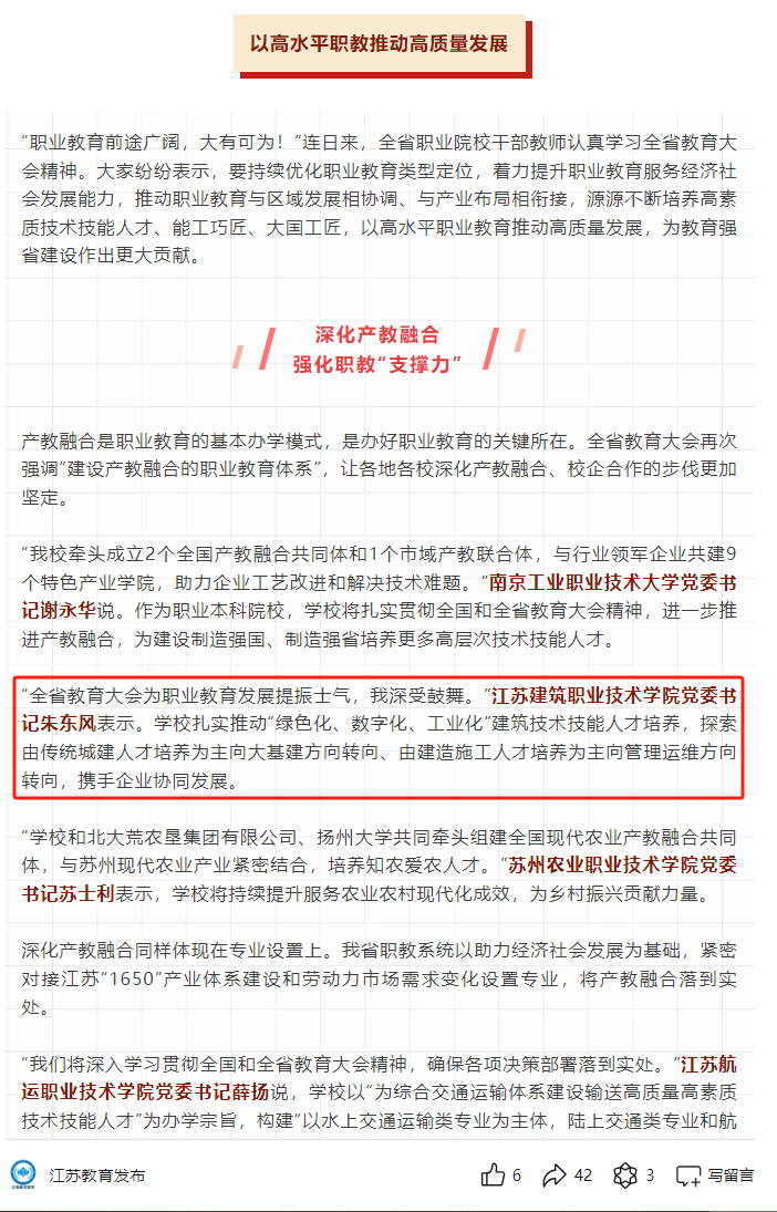 “全省教育大会为职业教育发展提振士气,我深受鼓舞。”MK.COM党委书记朱东风表示。学校扎实推动“绿色化、数字化、工业化”建筑技术技能人才培养,探索由传统城建人才培养为主向大基建方向转向、由建造施工人才培养为主向管理运维方向转向,携手企业协同发展。