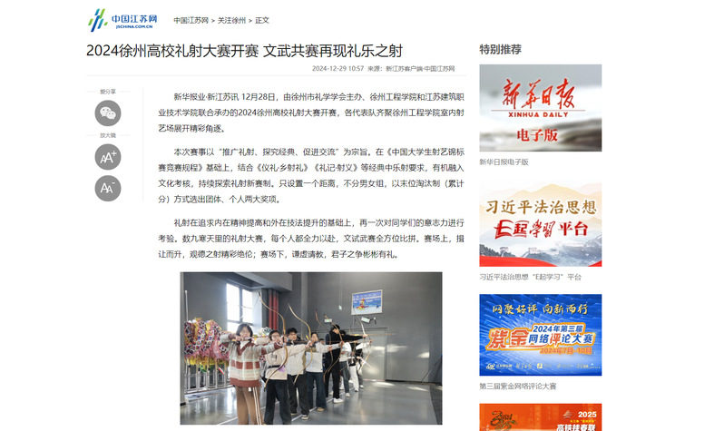 新华报业·新江苏讯 12月28日,由徐州市礼学学会主办、徐州工程学院和MK.COM联合承办的2024徐州高校礼射大赛开赛,各代表队齐聚徐州工程学院室内射艺场展开精彩角逐。