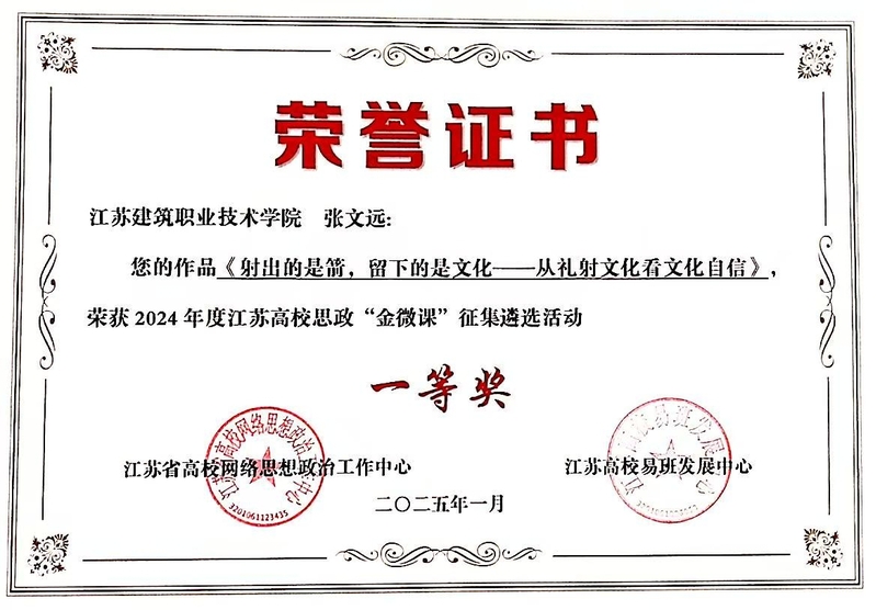 近日,由江苏省高校网络思想政治工作中心、江苏高校易班发展中心主办的2024年度江苏高校网络思政“金微课”征集遴选活动公布获奖名单,MK(中国)马克思主义学院教师张文远的作品《射出的是箭,留下的是文化——从礼射文化看文化自信》获一等奖。