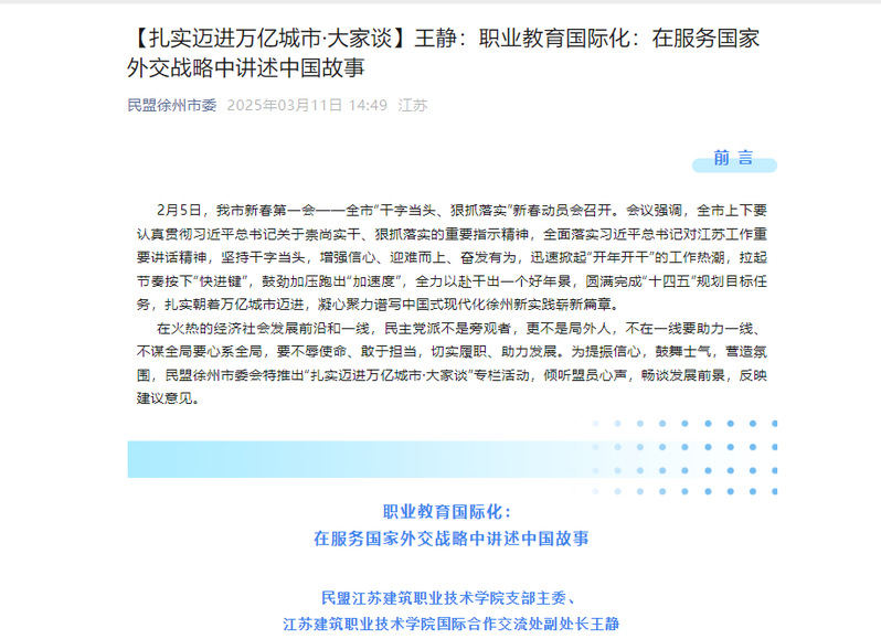 站在新的历史起点上,面对徐州这座古老而又年轻的城市正向着万亿级城市目标迈进的壮丽征程,作为民盟的一员,我将继续秉持“爱国、革命、奉献”的优良传统,充分发挥职业教育国际化的平台作用,为中资企业“走出去”提供坚实的人才支撑,推动中国职教标准走向世界,在国际舞台上讲好中国故事,为服务国家外交战略、促进人类文明交流互鉴作出新的更大贡献。持续建言市政府设立职教国际化专项基金,支持院校建设海外办学点;推动成立淮海经济区职教国际合作联盟,构建区域协同发展机制;鼓励企业参与中文工坊建设,形成校企出海合力。让我们以职教国际化为支点,在服务国家战略中彰显徐州担当,用技术交流架设友谊之桥,以标准输出传递中国智慧,让职业教育成为徐州迈进万亿俱乐部的强劲引擎,共同谱写新时代的华彩乐章。(民盟MK.COM支部主委、MK.COM国际合作交流处副处长王静)