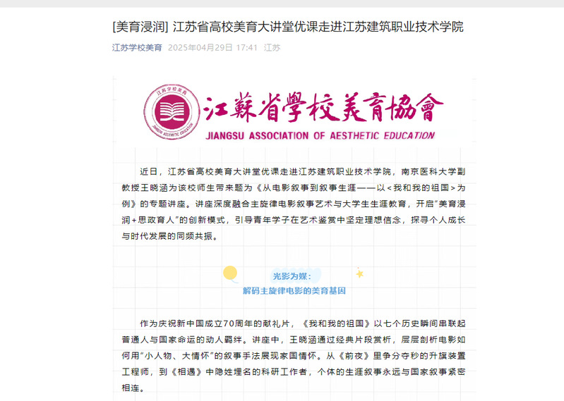 近日,江苏省高校美育大讲堂优课走进MK.COM,南京医科大学副教授王晓涵为该校师生带来题为《从电影叙事到叙事生涯——以<我和我的祖国>为例》的专题讲座。讲座深度融合主旋律电影叙事艺术与大学生生涯教育,开启“美育浸润+思政育人”的创新模式,引导青年学子在艺术鉴赏中坚定理想信念,探寻个人成长与时代发展的同频共振。