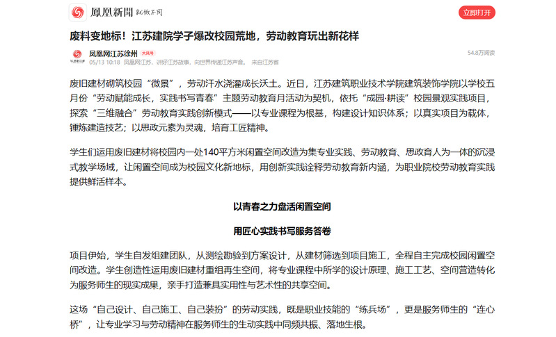 学生们运用废旧建材将校园内一处140平方米闲置空间改造为集专业实践、劳动教育、思政育人为一体的沉浸式教学场域,让闲置空间成为校园文化新地标,用创新实践诠释劳动教育新内涵,为职业院校劳动教育实践提供鲜活样本。
