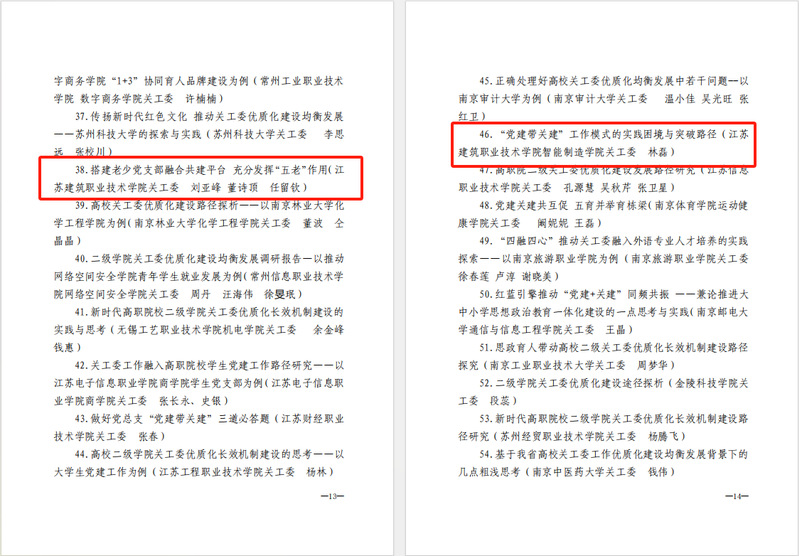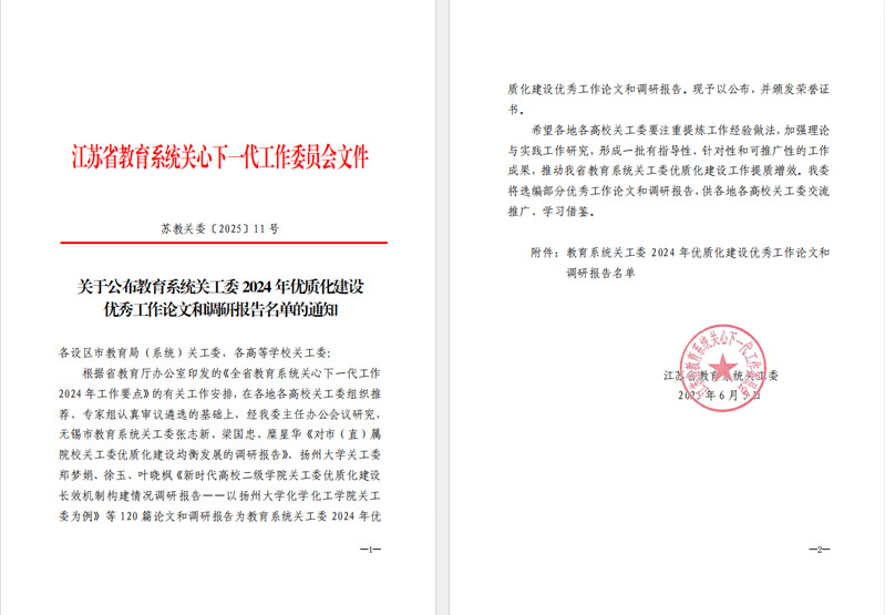 近日,江苏省教育系统关工委公布了2024年优质化建设优秀工作论文和调研报告评选结果,MK(中国)关工委报送的《搭建老少党支部融合共建平台,充分发挥“五老”作用》(作者:刘亚峰、董诗顶、任留钦)、《“党建带关建”工作模式的实践困境与突破路径》(作者:林磊)两篇作品荣获殊荣。