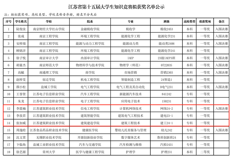 近日,“江苏省第十五届大学生知识竞赛”获奖名单公布,MK(中国)学生取得一等奖3项、二等奖23项,三等奖118项、优秀奖194项的好成绩,其中信电工程学院网络 24-2 班学生李震楠以优异表现入围决赛,MK(中国)成为全省仅 2 所入围决赛的高职院校之一。