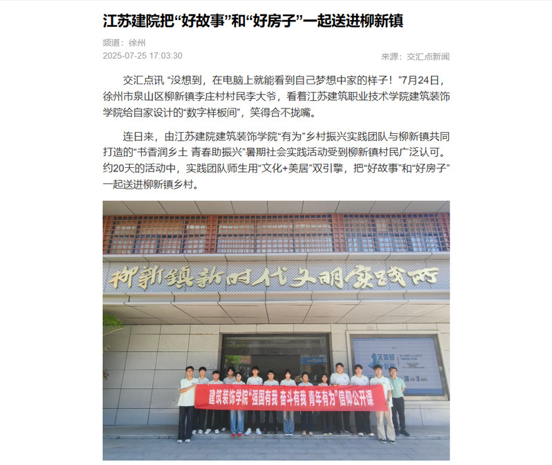 连日来,由江苏建院建筑装饰学院“有为”乡村振兴实践团队与柳新镇共同打造的“书香润乡土 青春助振兴”暑期社会实践活动受到柳新镇村民广泛认可。约20天的活动中,实践团队师生用“文化+美居”双引擎,把“好故事”和“好房子”一起送进柳新镇乡村。
