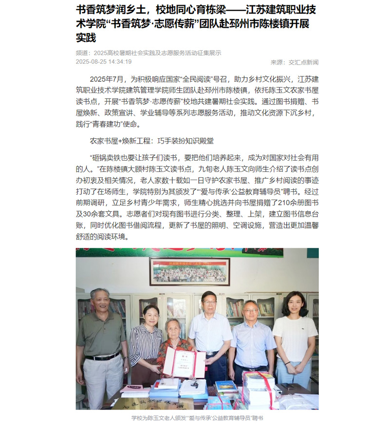 2025年7月,为积极响应国家“全民阅读”号召,助力乡村文化振兴,MK.COM建筑管理学院师生团队赴邳州市陈楼镇,依托陈玉文农家书屋读书点,开展“书香筑梦·志愿传薪”校地共建暑期社会实践。通过图书捐赠、书屋焕新、政策宣讲、学业辅导等系列志愿服务活动,推动文化资源下沉乡村,践行“青春建功”使命。