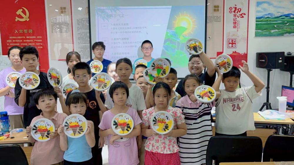 随后,实践团结合时令节气,让传统文化变得“触手可及”。大暑时节,志愿者不仅讲解节气习俗,还将非遗融入课堂:孩子们亲手制作二十四节气主题拨浪鼓,并用彩泥捏出西瓜、荷叶等大暑主题作品。临近立秋,课堂转向“啃秋”习俗与中药香囊制作。孩子们挑选艾叶、薄荷等药材,小心填充、编制成驱蚊香囊,脸上洋溢着成就感。