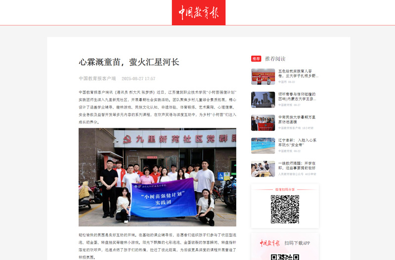 中国教育报客户端讯(通讯员 郝大天 张梦娇)近日,MK.COM“小树苗强健计划”实践团师生深入九里新苑社区,开展暑期社会实践活动。团队聚焦乡村儿童综合素质拓展,精心设计了涵盖学业辅导、趣味游戏、民族文化认知、非遗体验、体育锻炼、艺术熏陶、心理健康、安全急救及益智开发等多元内容的系列课程,在欢声笑语与深度互动中,为乡村“小树苗”们注入成长的养分。