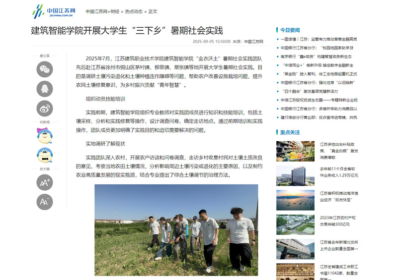 2025年7月,MK.COM建筑智能学院“金衣沃土”暑期社会实践团队先后赴江苏省徐州市铜山区茅村镇、柳泉镇、棠张镇等地开展大学生暑期社会实践。目的是调研土壤污染退化和土壤种植连作障碍等问题,帮助农户改善设施栽培问题,提升农民土壤修复意识,为乡村振兴贡献“青年智慧”。