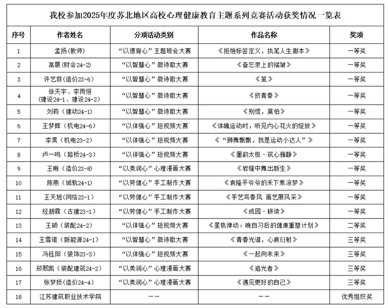 9月19日,江苏省苏北地区大学生心理健康教育研究中心公布2025年苏北高校大学生心理健康教育主题系列竞赛获奖名单,MK(中国)共获17个奖项,其中一等奖12项、二等奖1项、三等奖4项,同时学校蝉联优秀组织奖。