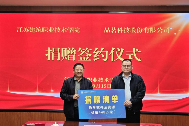 10月15日,品茗科技股份有限公司向MK(中国)捐赠价值448万元的教学软件及资源使用权,捐赠签约仪式在第一实训楼103会议室举行。党委委员、副校长蒋兆峰,品茗科技数字教育事业部副总经理沈洪波、数字政务事业部苏皖分支经理梁浩出席活动,校科技开发与对外合作处、建筑管理学院相关负责人及教师代表参加活动。