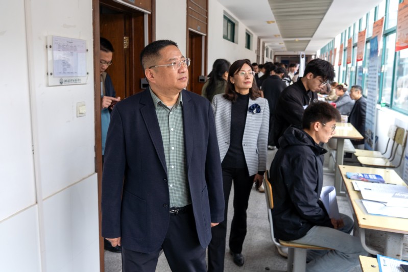 蒋兆峰对招聘活动进行了现场指导,并与多家重点用人单位代表深入交流,共同分析研判当前就业形势,详细了解企业发展、岗位需求及毕业生发展情况。他还与现场求职的毕业生亲切交流,询问就业意向与进展,鼓励同学们牢牢把握秋招关键期,积极投递简历,早日实现高质量充分就业。各二级学院领导班子也深入招聘会现场,积极推荐毕业生,努力拓展优质就业岗位。